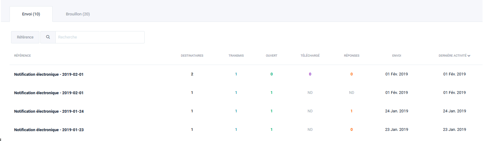 Cette option vous permet d'accéder à l'ensemble des notifications que vous avez envoyé, tout en vous laissant la possibilité d'accéder au détail de chacune (rapport de preuve, réponse du destinataire, copie de la notification envoyée, etc).
